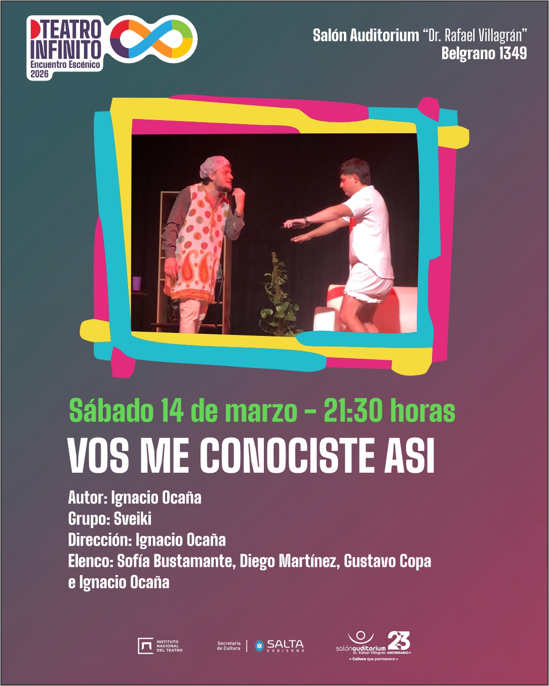 El Encuentro Escénico Teatro Infinito, espacio que promueve la cultura que permanece, presenta el sábado 14 de marzo a las 21:30 horas la obra «Vos me conociste así». Con texto y dirección de Ignacio Ocaña para el grupo Sveiki, la pieza disecciona la crisis de un matrimonio joven que se encuentra en un punto de no retorno. Los egos, la incomunicación y la irrupción de terceros transforman la convivencia en un laberinto emocional. El elenco, integrado por Sofía Bustamante, Diego Martínez, Gustavo Copa e Ignacio Ocaña, da vida a este relato crudo y actual. La función se llevará a cabo en el Salón Auditorium y los tickets pueden gestionarse a través de la web www.auditoriumsalta.com